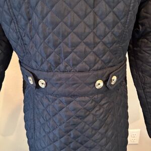 Chicos Quilted Black Jacket, Chico’s Size 0, US size 4, Chore, Barn, Everyday, Classic, Staple, Layering, Button Front, Four Front Pockets, Button Detail at Back, Quilted construction, made to be lightweight, sleek, and comfortable. 100% Polyester, 100% Polyester, Dry Clean. In Great Pre-Owned Condition, Approximate Measurements in Pictures.