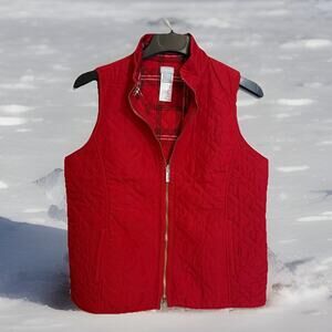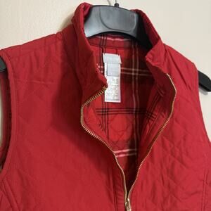Excellent condition. No stains flaws or defects. The zipper and pull are gold. The Chicos Quilted Vest in red with a plaid lining is a stylish and versatile piece for women in size 8/10. Made of polyester, this vest features gold hardware accents, four pockets, and a zip closure. Perfect for the winter, fall, or spring seasons, this vest adds a touch of metal theme to any outfit. The Chico's brand ensures quality and style in this chic quilted vest.