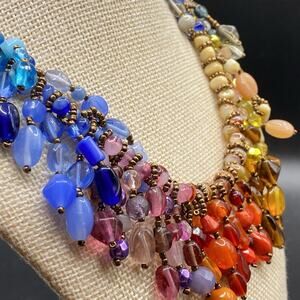 Chicos Rainbow Glass Beaded Necklace Fringe Multicolor Rainbow Statement