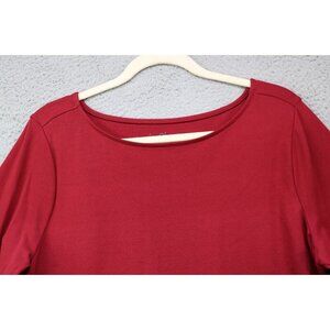 Chico's Red 3/4 Sleeve Boat Neck Top-Size 2 or Large. Item is in Excellent Condition. The material is 60% Rayon, 34% Nylon and 6% Spandex. Laying flat measuring armpit to armpit it is 22'' and 27'' in length.