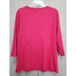This is a Chico's Red Cotton Embroidered Notch Neck 3/4 Sleeve T-Shirt Size 2 Large