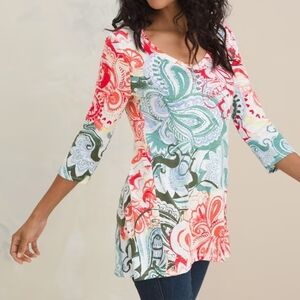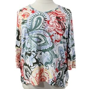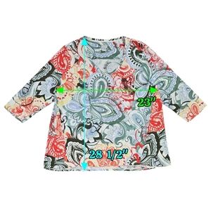 Good used condition, with no stains or tears. A bold, vibrant multicolor paisley top, with red and green being the main colors. Has a curved v-neck, 3/4 sleeves, and a slub texture. Comfortable and soft as it is a cotton modal blend.