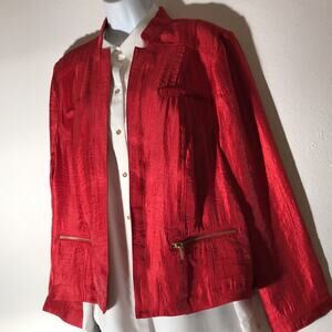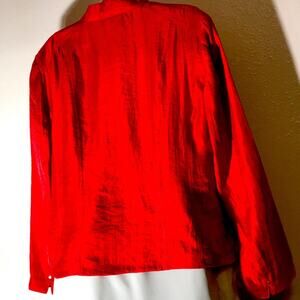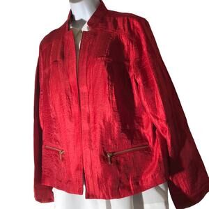 Red Unlined Long Sleeve Open Mandarin Collar Rayon Blend Jacket. Pit 20". Length 22". Item 0422-3