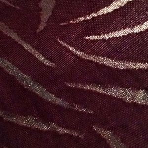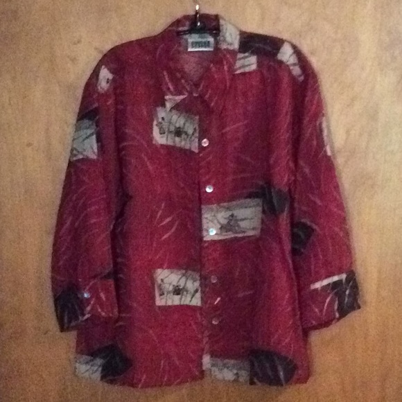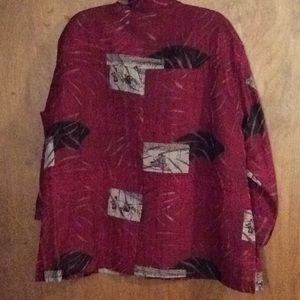 Lightweight button-front jacket by Chico's. Red base with abstract patterned panels. Long sleeves and classic collar. Easy layering piece with relaxed fit.