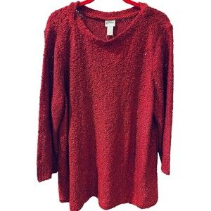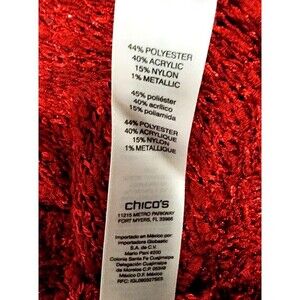 Get into the holiday spirit with this stunning Chico's pullover tunic sweater. The red sweater features a solid pattern with sequin accents, adding a touch of sparkle to your outfit. The open-knit fabric is made of acrylic, nylon, and polyester, making it machine washable.