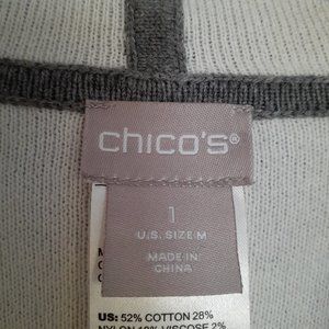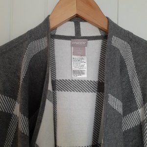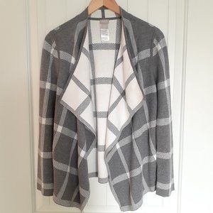 Very good pre-owned condition. Chico's Reversible Windowpane-Print Open-Front Cardigan. Size 1/Size Medium. Color: Gray and white.