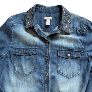 Chicos Rhinestone Collar Denim Chambray Button Up Shirt Long Sleeve Size 1