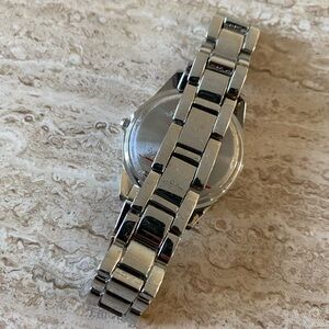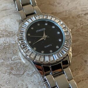 Preowned Chico’s silver rhinestone quartz watch. 1.25” diameter. Stainless steel back. No noticeable scratches or flaws. Needs a new battery.