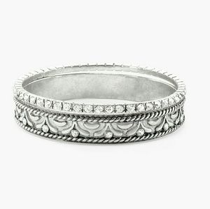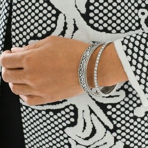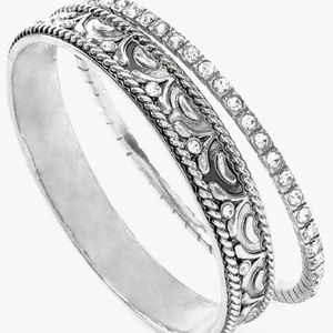 Delicate silver-tone bracelets complement each other in etched detail and rhinestone accents.