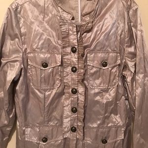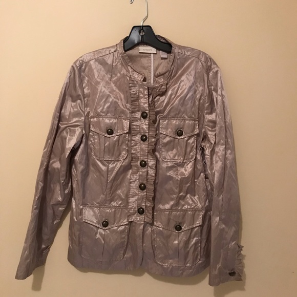 Chico’s Khaki Ruffle Texture Rory Jacket. Ruffle collar and cuff. Gold tone metallic sheen to the jacket. Armpit to armpit 22”, length 25.5”, sleeve length 24”