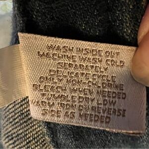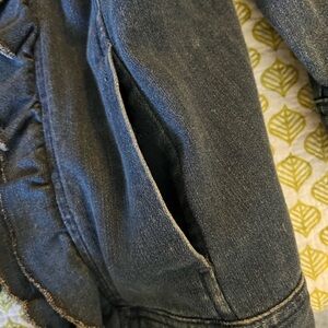 Chico’s unique open front jean jacket with ruffle trim and 3/4 length sleeves. Chico’s size 2. Lightweight. Measures approximately 21” PTP, 23” shoulder to hem, and 19” sleeve length.