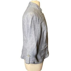 Chicos Ruffled Chambray Galinda Linen Open Front Jacket Blue Size 8 (Chicos 1)