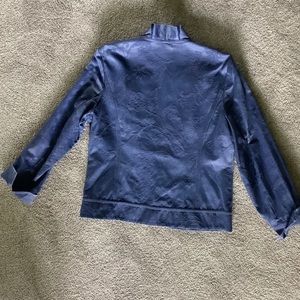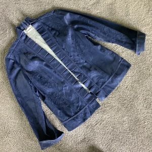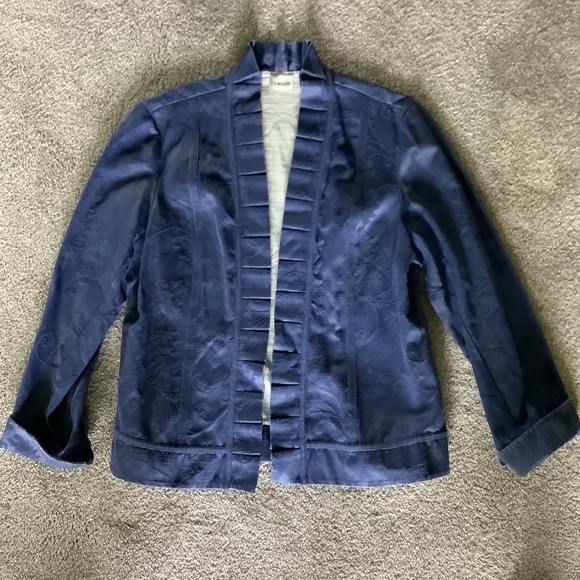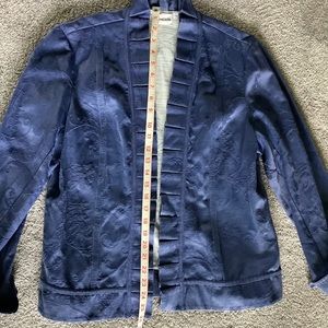 This women’s medium weight jacket is an open style. It’s a soft, cotton/poly blend with a brocade-like texture. The pattern is flowers and leaves in a beautiful shade of blue. It has a white interior and sweet ruffles down the front. It’s a women’s 10, it’s between a medium and large. Please see pics for measurements. Excellent condition.