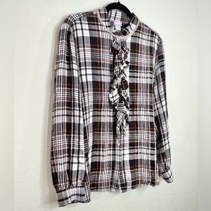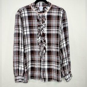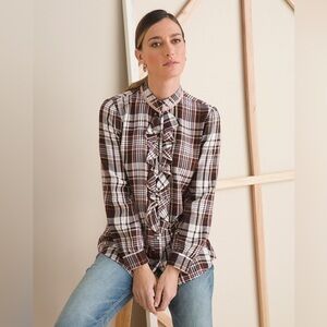 Design details give this ruffled plaid blouse a beautifully feminine look that's perfect for dressy or casual wear, ready to pair with pants and jeans. Velvet trim accents the neck, while the exposed placket is complemented by ruffles and covered buttons. Two-button cuffs complete the design, ensuring a perfect fit!