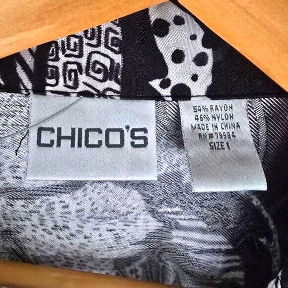 Chicos Safari Floral Retro Print Button Down Rayon Shirt in Black & White