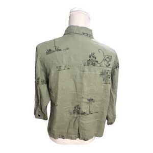 Chico's Sage Green Linen Monkey Print Button-Up Shirt Size 0 (4) Sude-Slit 3/4-Sleeve Collared Chest-Pocket