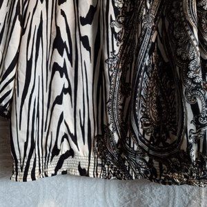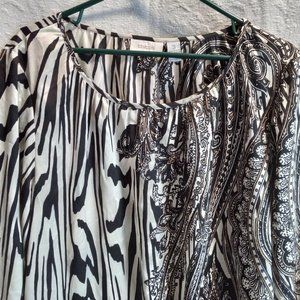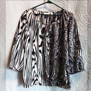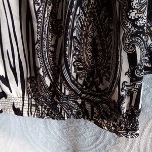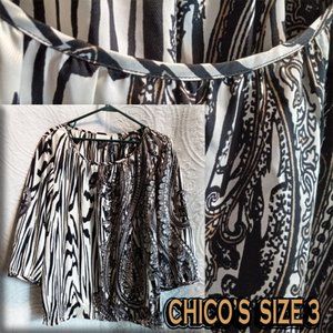 Chico's Satin Feel Black White & Gold Design Versatile Blouse W/Shirred Waist.