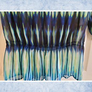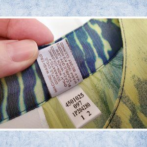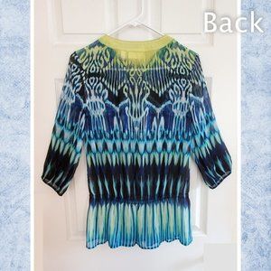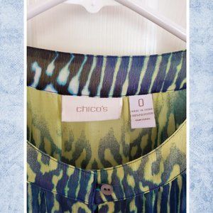 Excellent LIKE NEW pre-owned condition, Chico's split neck SEMI-SHEER top with 3/4 elasticized sleeves and front buttons (1/3 way down from neckline), slight elasticized flounce waist - 100% polyester, machine wash cold, gentle cycle. Standard Chico's size 0 = Small. Approximate measurements: 29.5" long, sleeves: 17.5" long, bust (underarm to underarm across front): 19". Original price and season unknown. No visible fabric pulls, rips, tears or stains. *See photos for details.