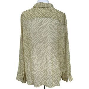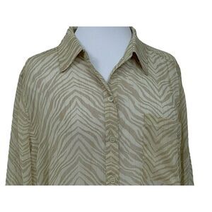 This Chico's Semi Sheer Effortless Danise Shirt Blouse Top in a Brushstroke Animal Print is a stylish choice for any woman. Its tan with a metallic gold pinstripe color and a pointed collar add an elegant touch, while the 48" chest, 26.5" length, and 22" sleeves ensure a comfortable fit.