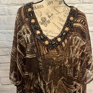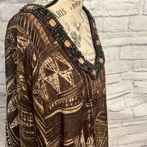Chico’s Sheer Flowy Caftan Top Boho Beaded V-neck Tribal Size Large/XL Brown