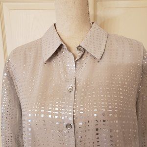 Chico's Sheer Tunic Style Blouse size 3. A Chico's size 3 is equal to a woman's 16/18. The top is gray and silver . The care instructions and fabric makeup is contained in the pictures. It is coming from a smoke free, pet friendly home, Excellent condition.