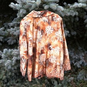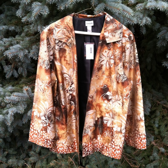 Chicos Shimmer Blossom Macaylis jacket in chocolate chip (brown, gold and camel) Size 3. Silk and polyester, brand new never worn. Embellished with sequins