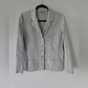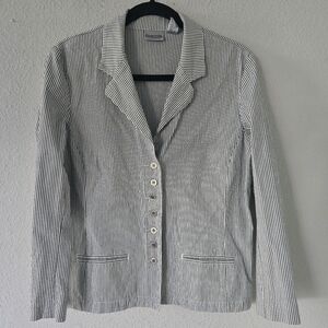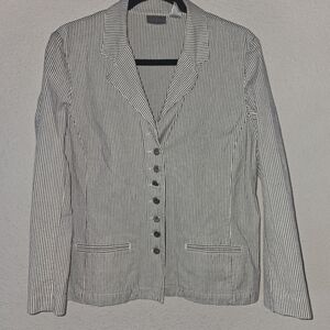 This Chico's jacket is a versatile piece perfect for any occasion. The striped pattern and collared design make it a stylish choice for formal events or workwear. The cotton/spandex outer shell material ensures comfort and durability, while the 100% cotton lining material adds extra warmth during cooler seasons.