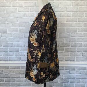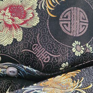 This exquisite Chicos kimono jacket features a luxurious silk blend, showcasing an Asian-inspired brocade design in black and gold. Perfect for adding an artsy touch to any ensemble.