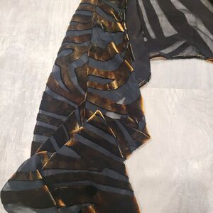 Chico's Silk Rayon Sheer Scarf 13” x 63” Gold Velvet Black Net Fringe Elegant