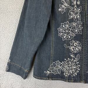 Chicos Silver Denim Jacket Medium Boho Artsy Embroidery Maximal Embellish Floral