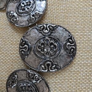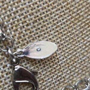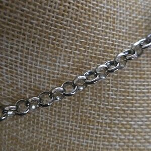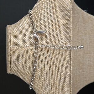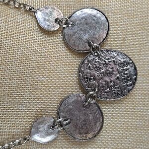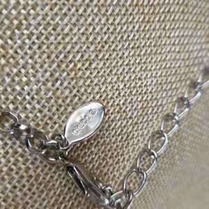 Chico's costume jewelry necklace with intricate silver designs. Bold and stylish for any occasion. Length: up to 21 inches. Makers mark intact. See the sweet rhinestone on back of name tag! This necklace is a real stunner!