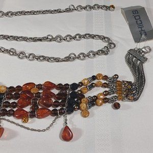 Elegant silver chain belt with amber and brown beads. Intricate design with dangling accents. Perfect for adding flair to any outfit.