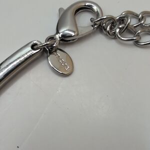 This modern necklace features a sleek curved silver bar that showcases a minimalist design. At its center, a prominent black sphere adds a bold focal point, while thin silver cords complete the elegant look.