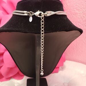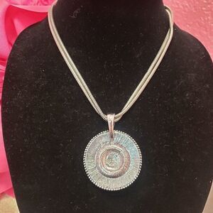 This silver and rhinestone medallion hangs on a double silver chain and has extender to make a bit longer.