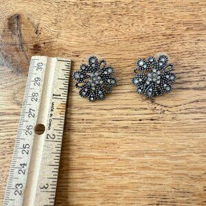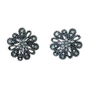 These silver-tone earrings feature intricate flower designs adorned with crystals, offering a sophisticated touch suited for professional or formal settings.