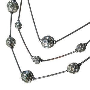 Add a touch of glamour to any outfit with this stunning Chico’s silver-tone multi-strand necklace featuring beaded sphere accents adorned with clear rhinestones or crystals. This elegant, layered design delivers a bold yet timeless statement, perfect for special occasions or elevating your everyday style.