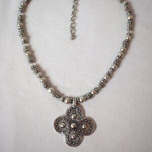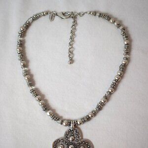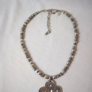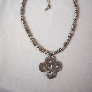 Chico's Silvertone Beaded Adjustable Necklace With Silvertone Clover Medallion
