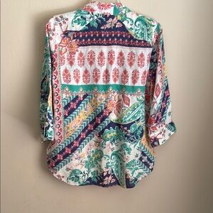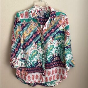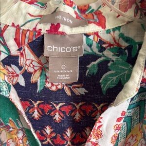 Chico's blouse with vibrant floral and geometric patterns. Features a mix of green, blue, red, and white.