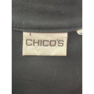 This Chico’s Size 0 jacket features a unique metal toggle buckle. Elegant in black, it is designed to flatter with a fitted cut. Perfect for both formal and casual events.