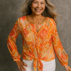 Beautiful Chico’s sheer chiffon blouse in a sunburst orange, gold, and coral abstract print. Features a shimmering sequin-trim neckline, button front closure, and flattering front tie hem. Lightweight, high-low silhouette perfect for spring, summer, or resort wear.