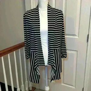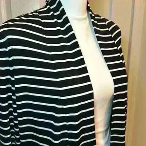 Chico's Black & White Size 0 (same as size 4/6) Striped Open Front Poly/Spandex Cardigan. 3/4 scrunched sleeve. Machine Washable. This cardigan is in excellent used condition. No rips, stains or tears. Travels well!