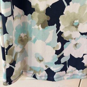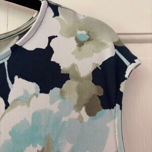 Embrace elegance with this floral print dress, featuring a blend of blue, green, and cream hues. Perfect for any occasion. Beautiful dress in preowned condition with no flaws.