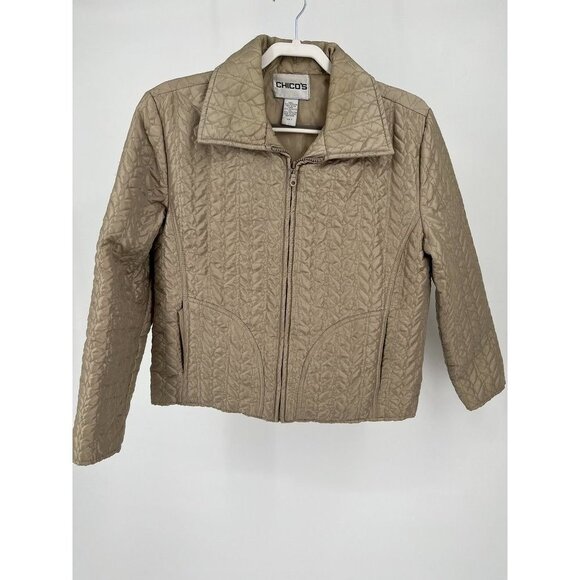 Chicos Size 1 Lightweight Quilted Jacket Tan Short Long Sleeve