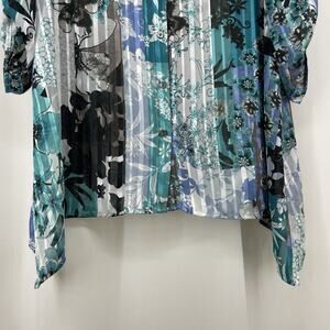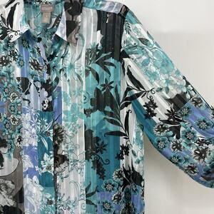 Chicos Size 1 Medium Asymmetrical Button Down Shirt Teal Blue Blouse Floral Top
