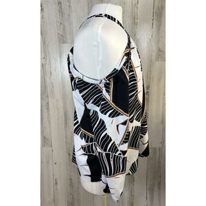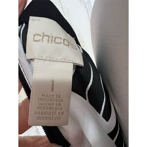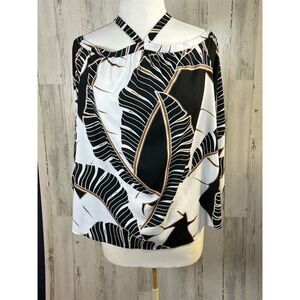 • Keywords: Chico’s, off-shoulder top, long-sleeve, women’s size M, tropical leaf, black white, casual