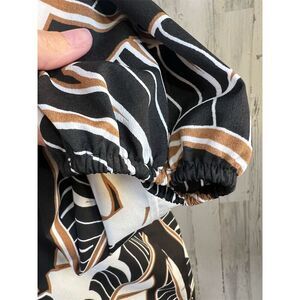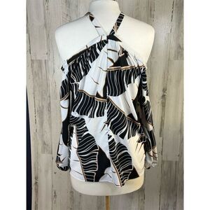 Chico’s off-shoulder long-sleeve top featuring a striking Black and White tropical leaf print with Brown accents. This chic, lightweight top has a halter-style neckline and gathered cuffs, perfect for a stylish casual look.