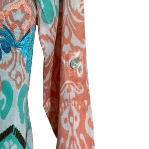 Chico's Size 1 US Size Medium Roll Tab Sleeve V-Neck Embroidered Coastal Beachy