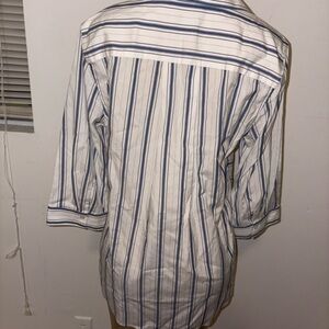 Stylish button-up shirt with blue and white stripes. Perfect for casual or formal wear.