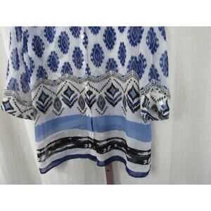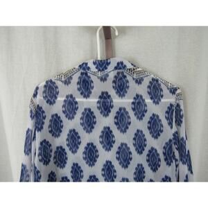 Chico's Size 2 Large Semi Sheer Blue and White Geometric Button Down Blouse