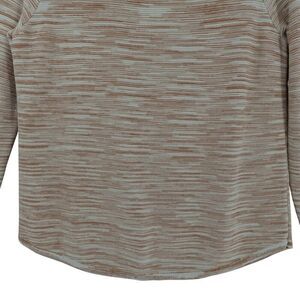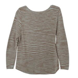 This Chico's sweater features a versatile tan and cream marled pattern for transitional styling. Made from a soft rayon-polyester blend, it offers a relaxed fit with lightweight warmth.